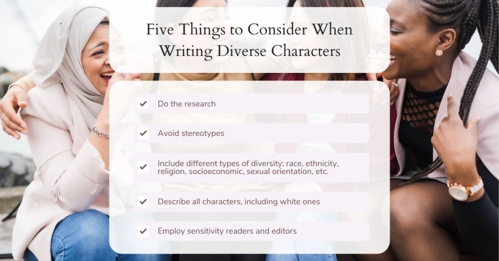 - Describe all the characters, including the white ones – There is nothing wrong with writing about white characters, but make sure to describe them. Also, learn culturally sensitive ways to describe minority characters. For example, do not use food to describe a Black character’s skin tone.